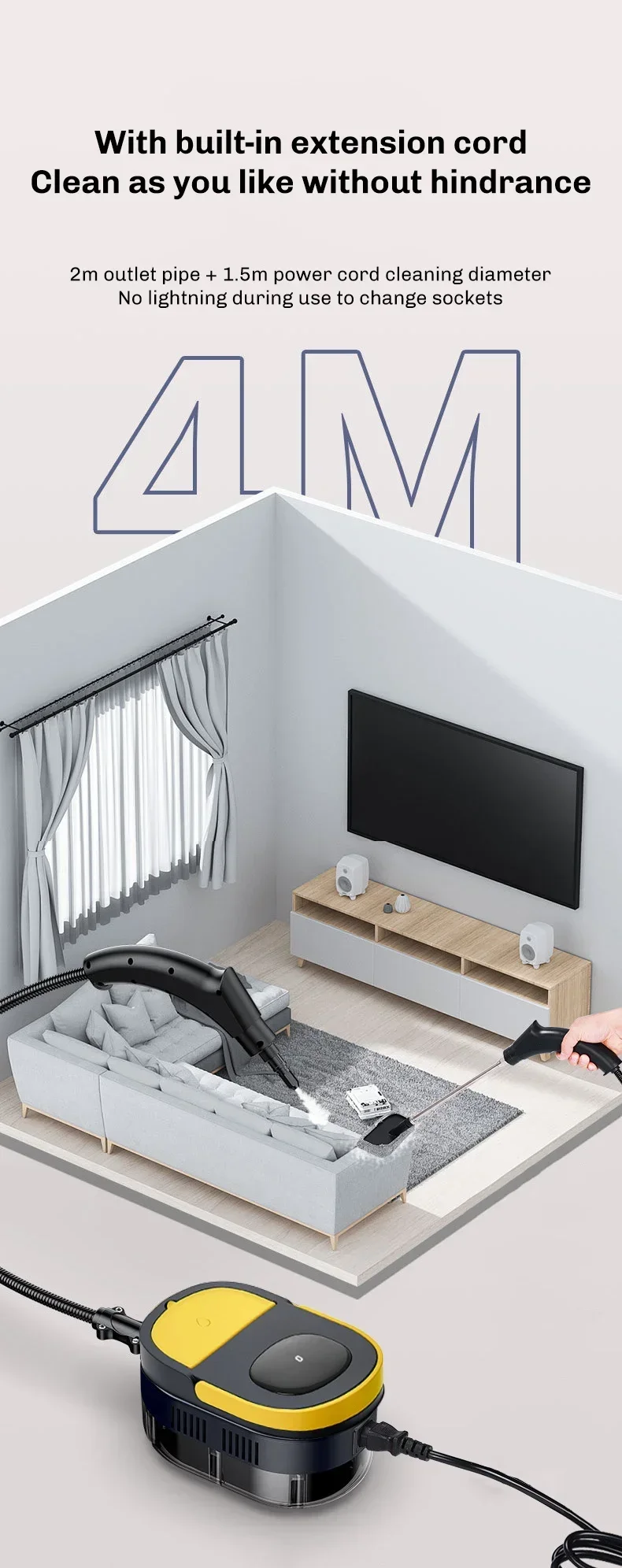 3.Lengthen the power cord and steam hose, single person operation is not laborious, can meet the cleaning needs.